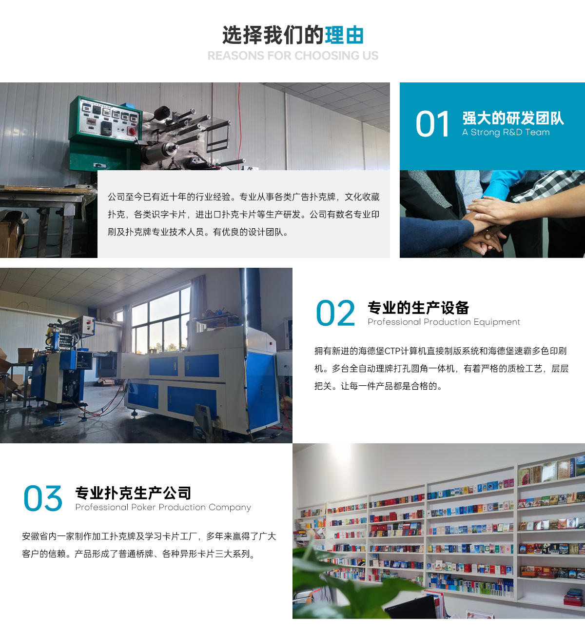 合肥采菊包裝有限公司 INTRODUCTION 創(chuàng)建于2011年,公司位于合肥廬陽(yáng)工業(yè)園區(qū)。公司主要經(jīng)營(yíng)項(xiàng)目:撲克印刷、學(xué)習(xí)卡片和文化收藏?fù)淇伺频?。多年?lái),公司一貫倡導(dǎo)“團(tuán)結(jié)、務(wù)實(shí)、進(jìn)取、創(chuàng)新”的企業(yè)精神,以市場(chǎng)為導(dǎo)向,以質(zhì)量求生存,以技術(shù)...
